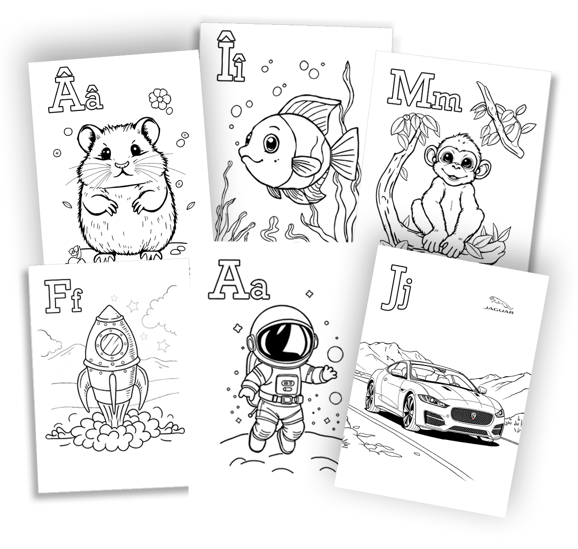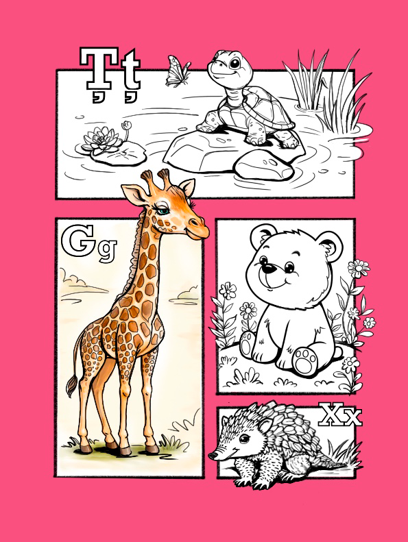 Abecedar cu animale de colorat pentru copii în imagini educative, cu vulpe, pisică, papagal, girafă și broască, disponibil gratuit în format PDF pentru print