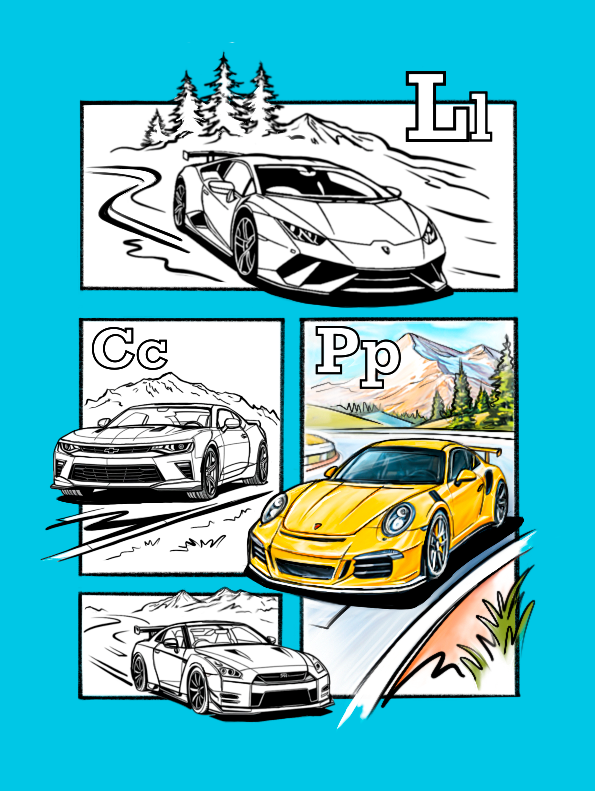 Abecedar cu masini de colorat pentru copii – descarcă gratuit un PDF educativ, ideal pentru învătarea literelor prindesene cu automobile.