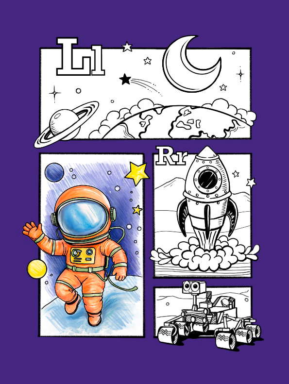 Abecedar spatial pentru copii – alfabetul în imagini cu rachete, planete, astronauti si stele, gata de descărcat gratuit si imprimat acasă.